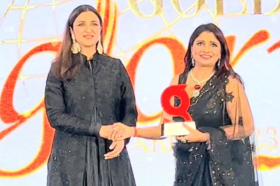 Pareeniti chopra gave awards to priya shah best match maker of the year 2023 golden glory awards bollywood edition at hotel Leela Mumbai