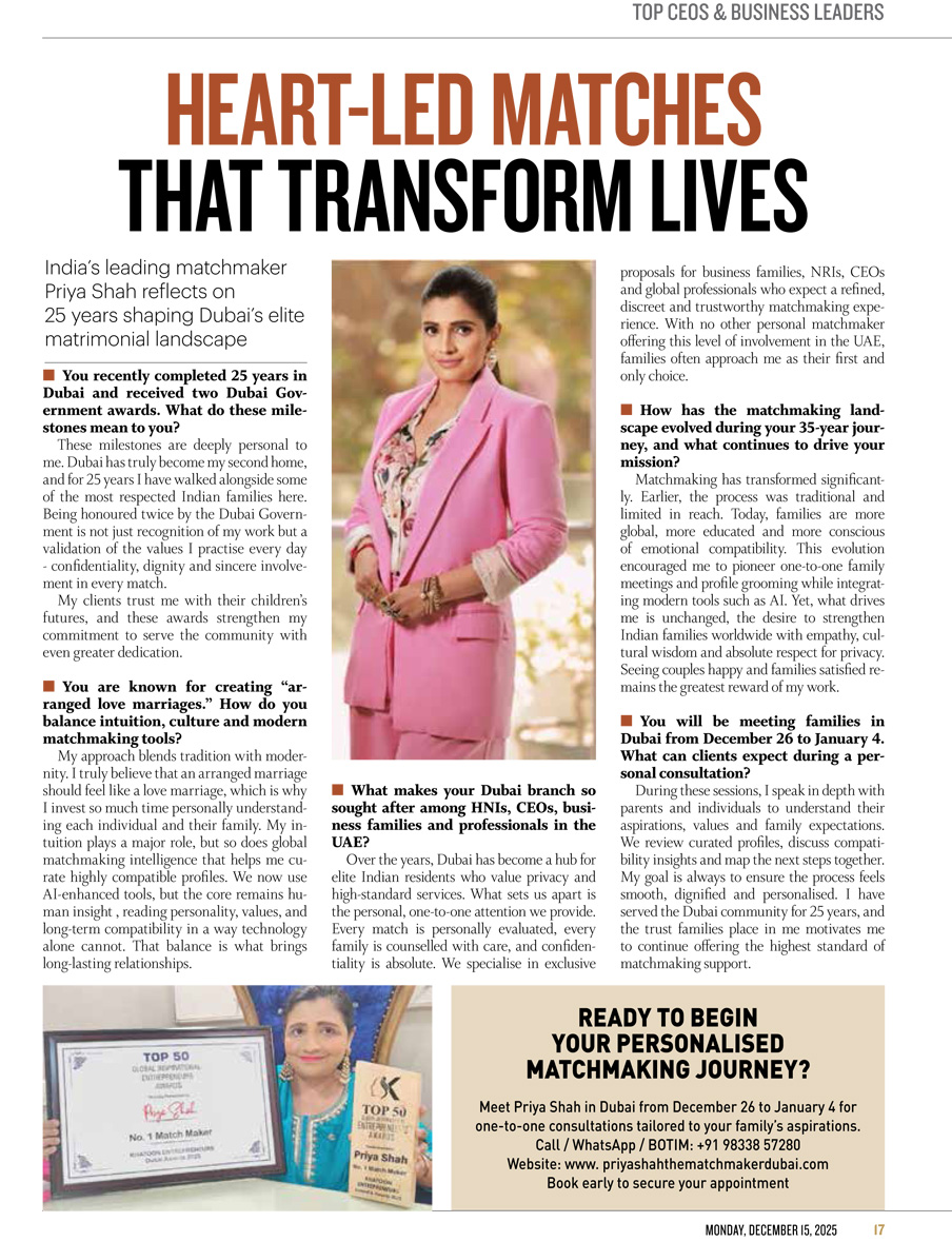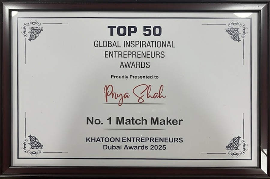Our Dubai branch is personally managed by Priya Shah – The Matchmaker’s son, Mr. Rushabh Shah, who serves as Partner & Director of the organisation. Under his dynamic leadership, the Dubai operations uphold the same premium, personalised matchmaking standards that have made Priya Shah – The Matchmaker the World’s No. 1 Matchmaker and India’s top matchmaking expert. With over 25 years of presence in Dubai, the branch caters exclusively to elite Indian and NRI clients across the UAE, offering bespoke “arranged love marriages with personal efforts” that reflect the trusted legacy of Priya Shah – The Matchmaker.