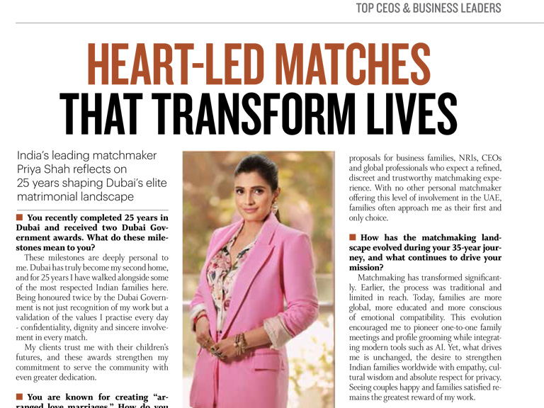 I have received prestigious recognition fror the Dubai Government as the No. 1 Matchmaker in Dubai - an honour that was also featured on the Forbes cover for my elite, high-profile matchmaking achievements.